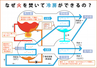 ▲クリックして拡大。 ※参考:矢崎総業株式会社「木質ペレット焚バイオアロエース」説明資料夏に打ち水をすると涼しくなります。これは水が蒸発するときに地面の熱を奪って温度が下がるからです。これを蒸発潜熱(気化熱)と言います。この原理をうまく使うことで冷房ができます。空調機として使うには効率を上げる必要があり、様々な工夫がなされています。