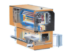 | 備考 | [標準装備] 1. ペレットサイロからのスプリングアームによる燃料積出し装置 2. 燃料搬送装置 3. ボイラ本体 4. 燃焼空気送風装置 5. 自動点火装置 6. 樹種・含水率に対応するO2センサー 7. 逆火防止用の安全装置8. 排ガスファン 9. 排ガス浄化装置(サイクロン) 10. 火格子と熱交換部の自動掃除装置 11. 灰収納箱 12. 制御盤 13. 防火用警報・安全装置 |