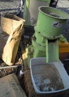 新興工機株式会社製(所在地:愛媛県伊予郡)のものです。操作はタッチパネル式。50mmで入れたものを15mmにし、固形、粒状化製品に成形可能です。
