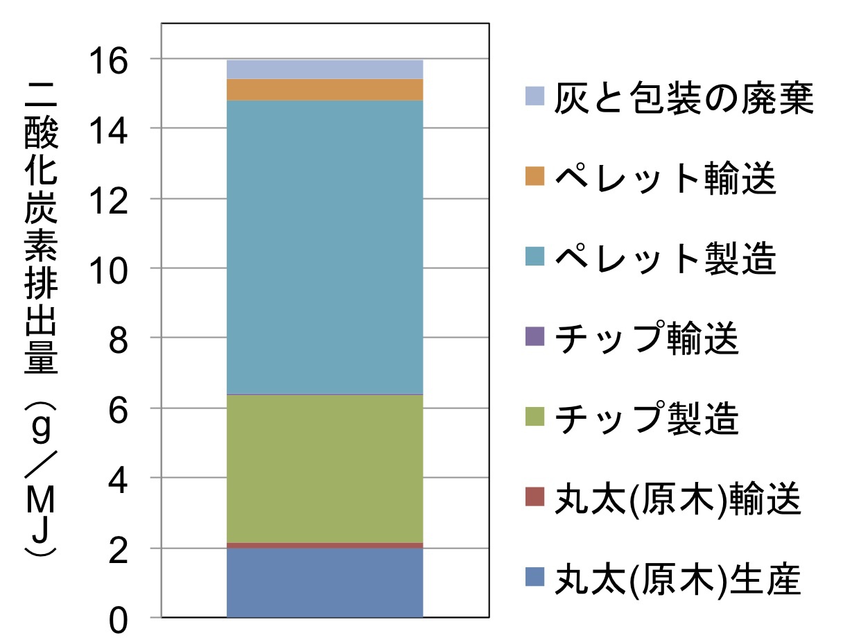 - 京都産木質ペレットのライフサイクルにわたる化石燃料起源の二酸化炭素排出量を工程ごとに見たものです。木質ペレット1MJあたりの二酸化炭素排出量は、約16g-CO2と試算されました。また、ペレットの製造が全体の約53%、チップの製造が約26%を占めました。ペレットの製造時には乾燥工程があるほか、高温高圧でペレットに成型するため、エネルギーを多く消費します。