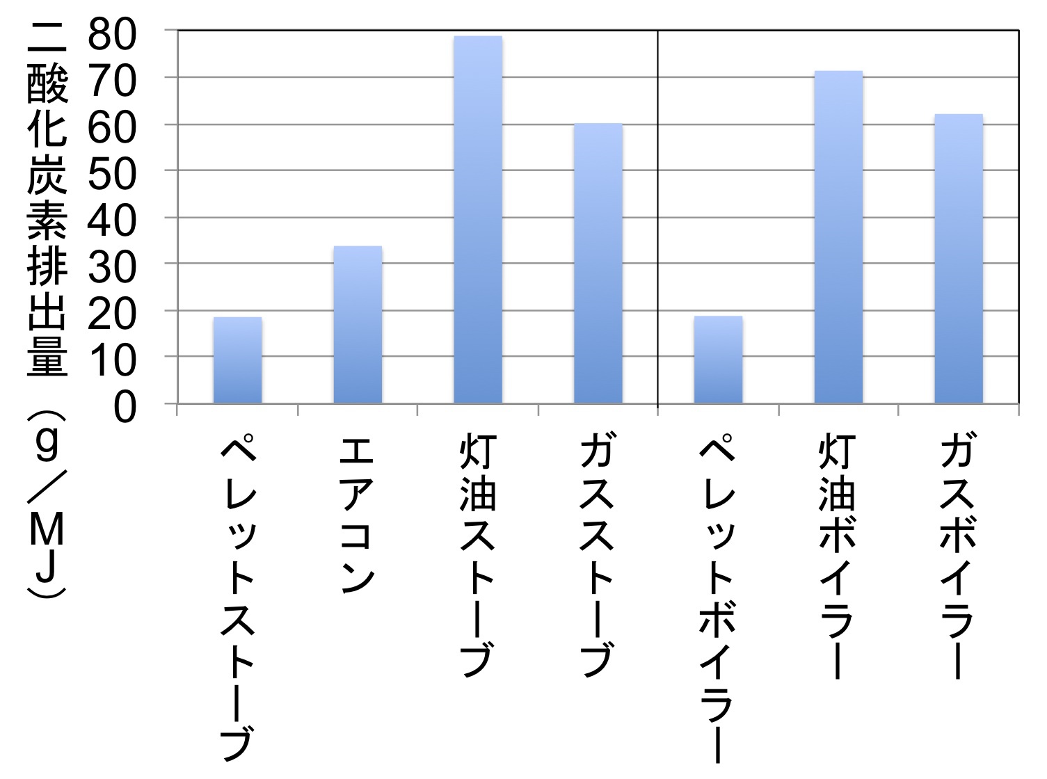 - ペレットストーブやペレットボイラーの二酸化炭素排出量を他の暖房器具やボイラーと比較したものです。ペレットストーブを使えば、エアコンの約1/2、灯油ストーブの約1/4まで排出量を減らすことができます。木質ペレットは、燃焼時の排出量がカーボンニュートラルであることから、高い二酸化炭素削減効果があります。生産工程の効率化でさらに排出量を削減することが可能となるでしょう。