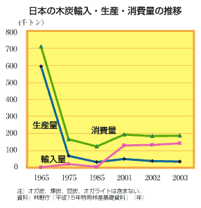 | グラフは、日本の木炭生産、輸入、消費の量を示しています。生産と消費の両方が高度経済成長による燃料革命(木質燃料から灯油やガスへの転換)の終わった1965年から1975年にかけて急減していますが、1985年に消費は底を打った後に少し増えています。これは水質浄化や土壌改良といった新たな用途が開拓されたこと、主に飲食店で木炭を使うケースが増えたことが理由として考えられます。でも、国内の生産量は減り続けたので、グラフに示されているように、輸入された炭が不足分を補いました。 |