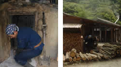 三州足助屋敷にある炭焼き窯は、現在三代目の自称「全国最年少の炭焼き職人、茨城から来た核弾頭」という炭焼きさんが焼いています。炭焼きを経験したことのない若い人にやってもらうと大変喜ばれるそうです。 |