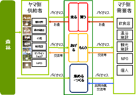 これらの取組で面白いのは、いわゆる「売る/買う」といった市場取引だけでなく、「あげる/もらう」「(みんなで)集める・つくる」といった形態で、薪炭の地産地消を(量的にはわずかではあるにしろ)実現しつつあることである。(下図参照)