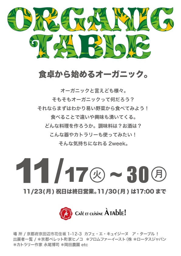 11月17日〜30日まで▶cafe et cuisine A table! (カフェ・エ・キュイジーヌ・ア・ターブル)主催で▶「オーガニックテーブル」を開催します。ヒノコから木の器・木工品などを出展しています。