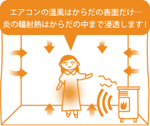 輻射熱とは太陽の暖かさや炭火と同じ遠赤外線の熱線で、からだの奥まで浸透するため、芯からじんわり暖かくなる感覚があります。家の壁や床の内部まで遠赤外線は到達するため、部屋全体の温もりが持続します。