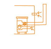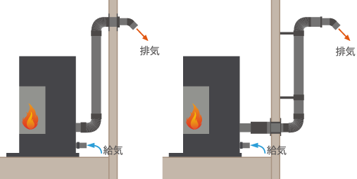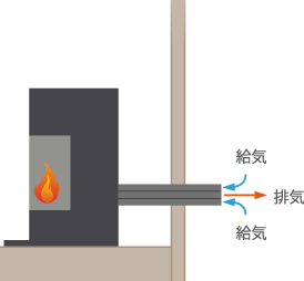 ペレットストーブの配管・設置イメージ図は以下の通りです。給排気の種類やストーブの特性、また住宅事情によって配管方法は異なります。詳しくは販売店にご相談下さい