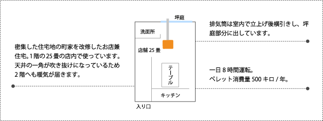 これ1台ですごく暖かいですよ。吹き抜け部分から2階へ暖気が上っていくので、一日運転していると2階も大変暖まります。逆に1階奥のキッチン部分へはあまり暖気が行きません。ストーブの上にレトロな扇風機を置いて暖気を回します。ただ乾燥がひどく家の梁がねじれたりテーブルにひびが入ってしまったので加湿器を使っています。音は静かではないですが店舗での使用でもありますし許容範囲です。